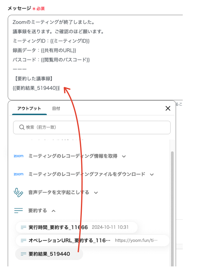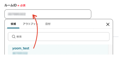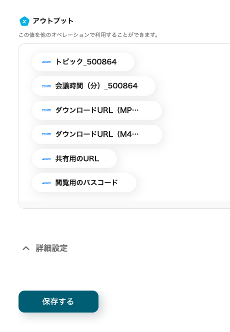 Zoomのトリガーのアウトプット(取得した値)からミーティングIDを選択しましょう。