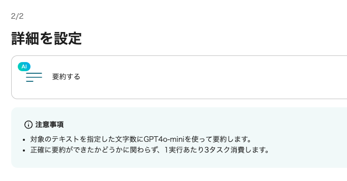 Chatworkのトリガー設定では、どのルームの投稿を対象にするか、ルームIDを任意で設定してください AI機能による要約では、Chatworkから取得した投稿内容だけでなく、投稿者名などの変数を加えて要約条件を詳細にカスタマイズできます Notionにレコードを追加する際、どのプロパティに要約結果や投稿日時などを割り当てるか、任意で設定することが可能です ■注意事項