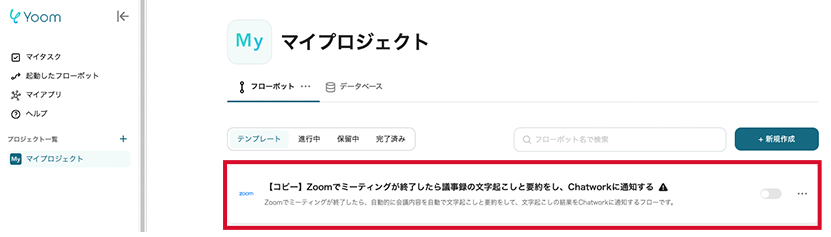 ここから「Zoomでミーティングが終了したら議事録の文字起こしと要約をし、Chatworkに通知する」自動化を、Yoomのフローボット テンプレートを用いた作り方 を解説します。