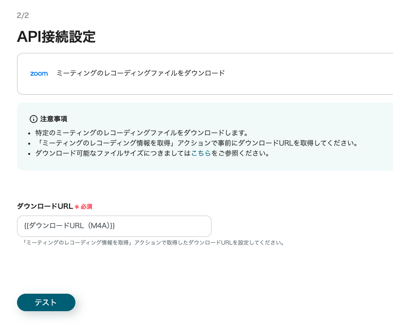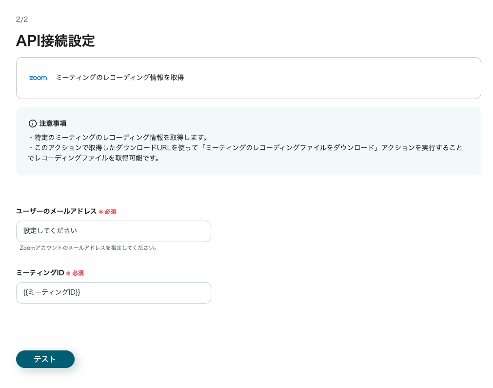 ※Zoomのレコーディング情報を取得する には、ミーティングがクラウドレコーディングされている必要があります。クラウドレコーディングはZoomの特定プランでのみ利用できます。