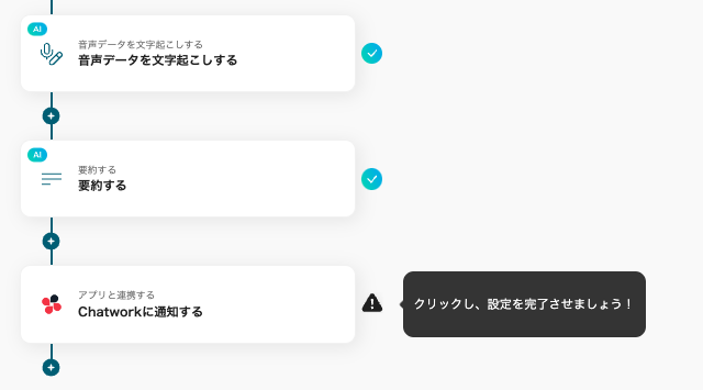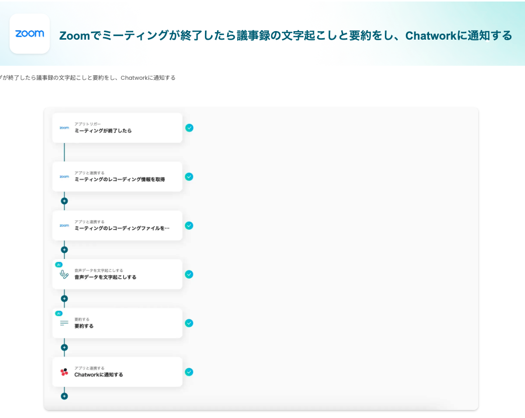 今回ご紹介したZoomとChatworkの自動化フローにより、会議後の議事録作成や共有がスムーズに行えるようになります。AIを使ってZoom会議の内容を自動で文字起こし・解析し、要約された情報をChatworkで即時共有することで、手作業による負担を軽減し重要な業務に集中できます。情報が確実にチームに届き、迅速に共有されるため、次のタスクへの移行がスピーディーに進みます。プログラミング不要で簡単に導入できるこの自動化フローを活用することで、会議後のフォローアップ作業をより効率的に進めることができるでしょう。 この自動化フローで、会議後の作業をさらにスムーズに!今すぐ導入してみませんか?