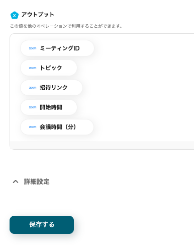 →テストをクリックします →成功 アウトプットではミーティング情報の詳細が取得できます。 →保存するをクリックします