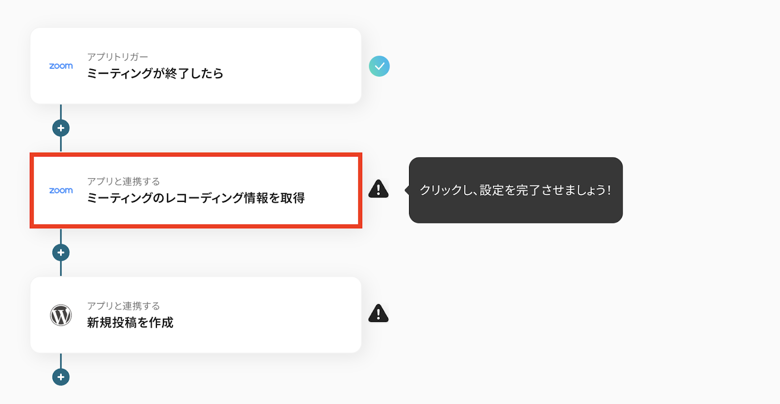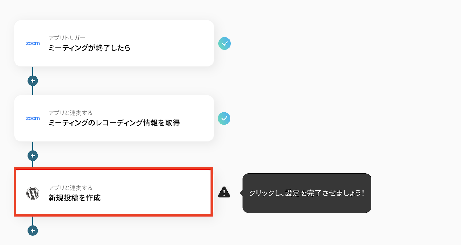 このワークフローを利用することで、Zoomミーティングが終了した際に自動的に録画リンクや概要がWordPressに投稿されるため、情報の共有がスムーズに行えます。