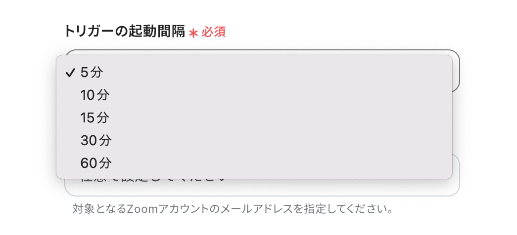 「トリガーの起動間隔」を5分・10分・15分・30分・60分から選択します。