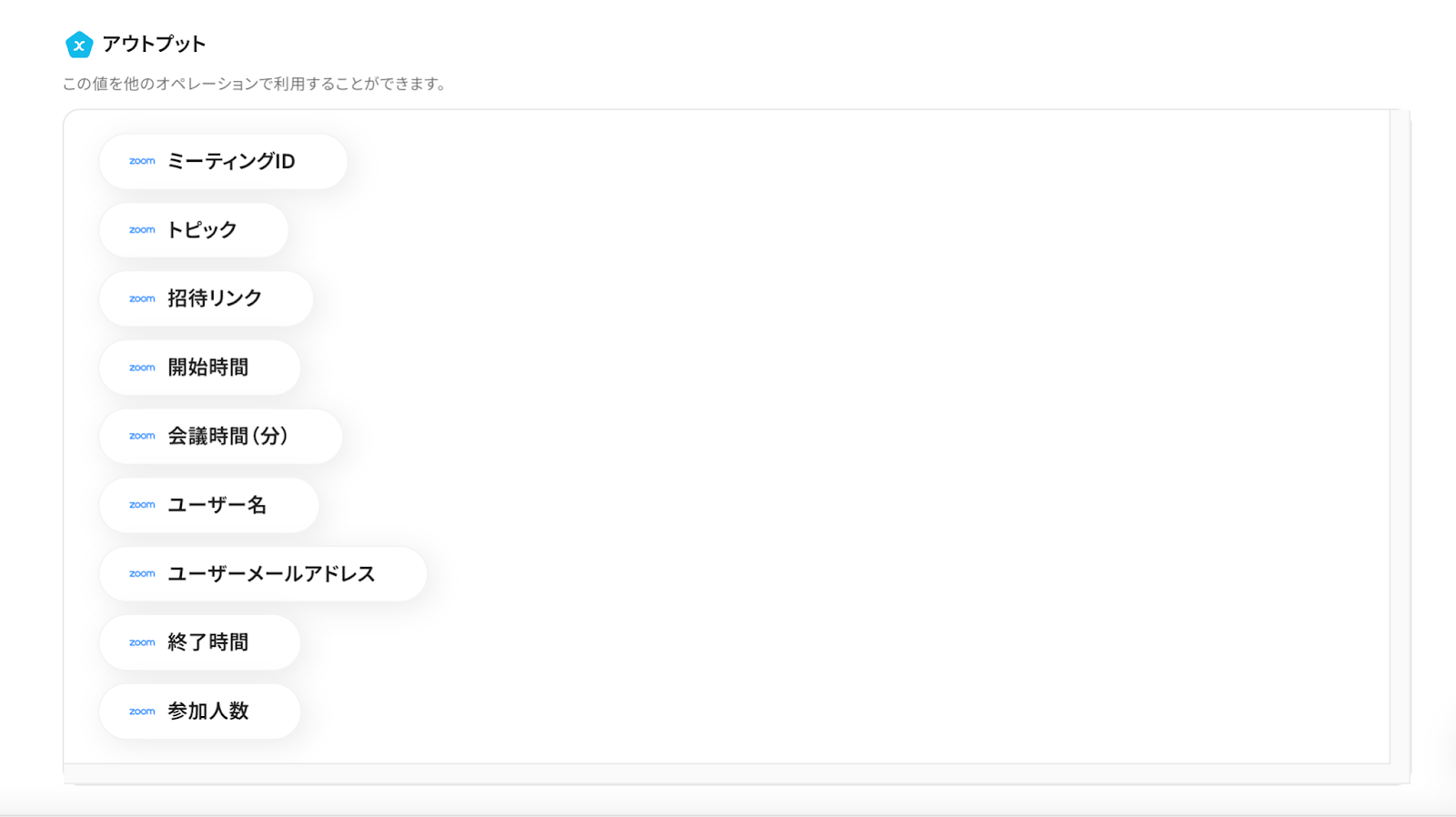 (画像には表示されていませんが、実際にはアウトプットされた値が項目の横に表示されます。)