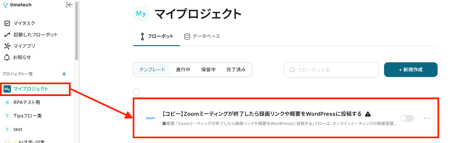 左側にあるメニューの「マイプロジェクト」から、コピーしたテンプレートを開きます。