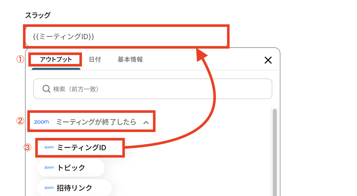 今回は「ミーティングID」をスラッグとした場合の方法です。
