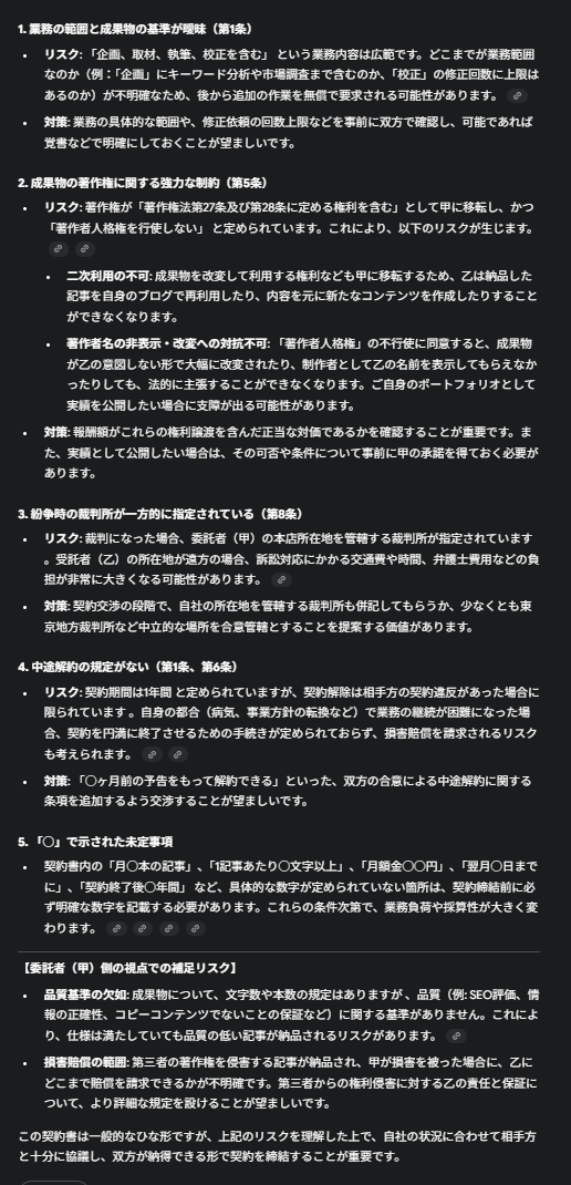 一つ大きな違いだと感じたのは、リスク箇所の抽出部分です。Qwenは発注者のリスクを中心に抽出していましたが、Gemini2.5PROは受注者が注意すべき点をまず抽出していました。指示文章は「主要な条項の要約と、自社に不利になりそうなリスク箇所を教えてください」と発注者の目線となっていたため、Qwenのほうがよりプロンプトに忠実な返答があったと言えます。ただ、Gemini2.5PROのほうが網羅的という捉え方もできるため、あくまでユーザーの好みにゆだねられるほどの違いでしょう。