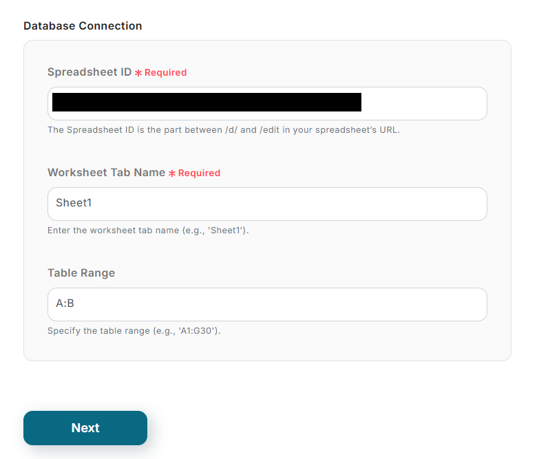 Set the spreadsheet ID and worksheet tab name. Click the field to select from options or refer to the annotation to quote from the URL of the relevant sheet for the spreadsheet ID. For the worksheet tab name, either select from options or enter the tab name directly. After setting, click "Next".