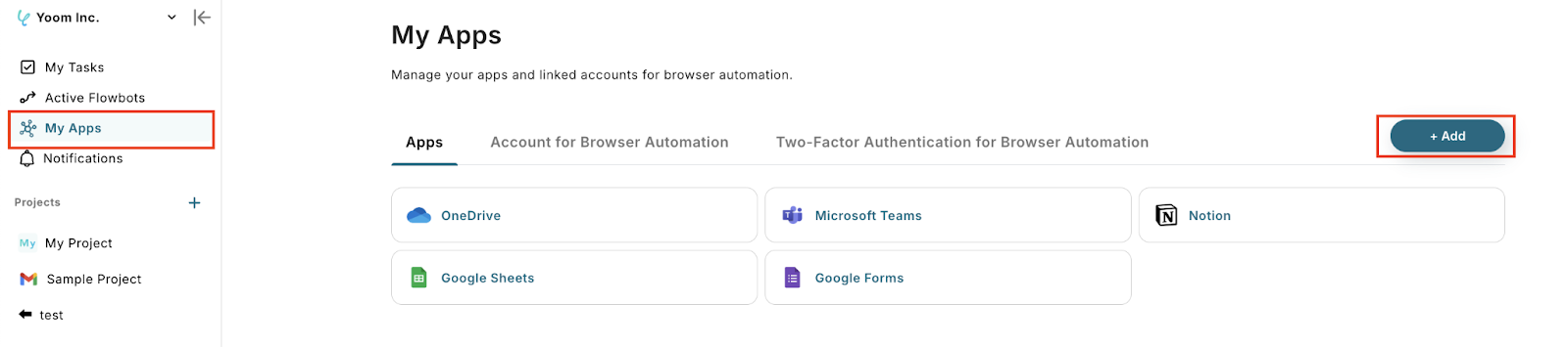 Click "+ Add" from "My Apps" in the left menu of the Yoom screen.