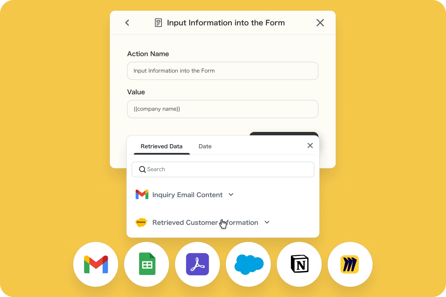 Integrate your flow with a wide range of platforms and AI tools. Input data into apps or your systems directly from the browser.