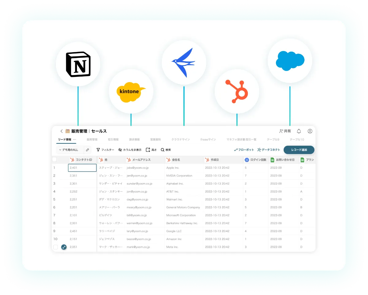 Yoomがあらゆるサービスと連携して、データベースに散逸したデータを集約することで情報を一元管理します。