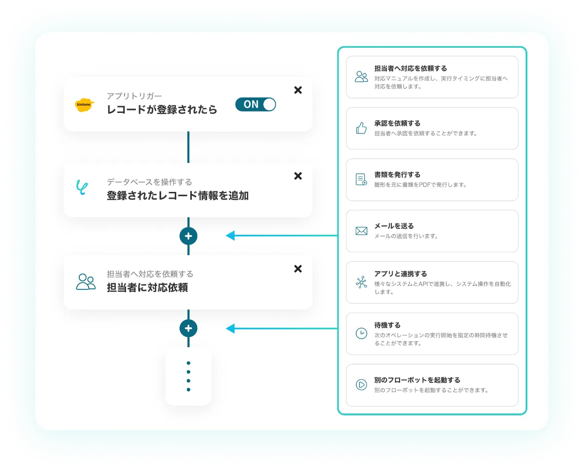 集約したデータを活用してメール送付や書類作成といった業務をフローボットで作成し、定型業務フロー全体を自動化できます。