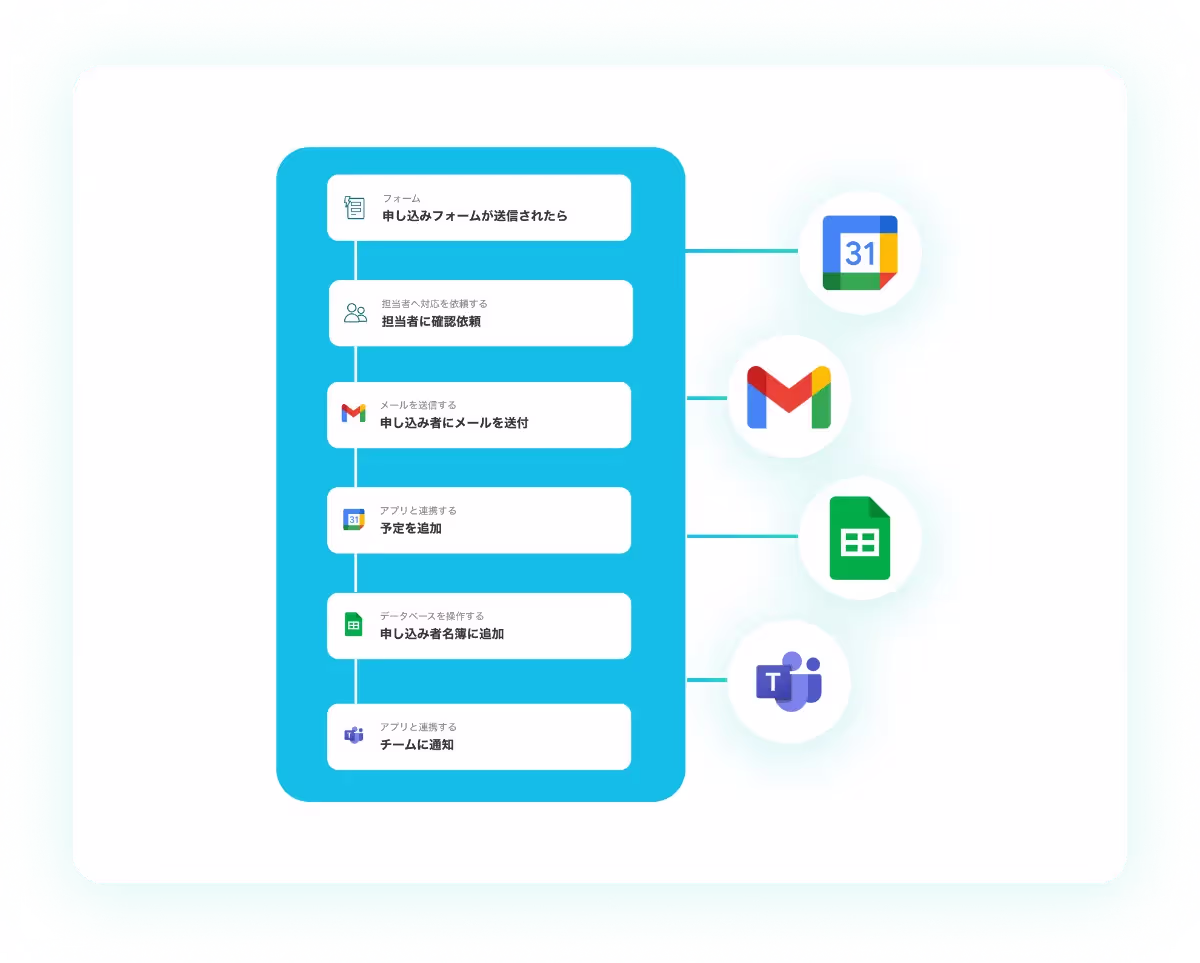 申し込みフォームをドラッグ&ドロップで手軽に作成し、様々なSaaSやAIとノーコードで連携して業務フローを自動化!