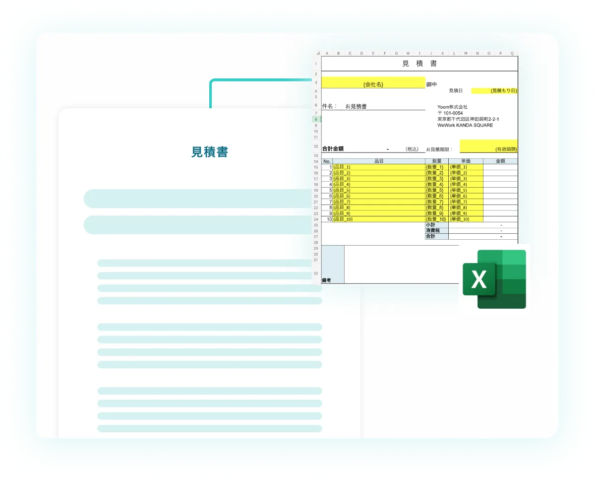 Yoomのフローボットが自社のエクセル雛形からの見積書の作成、送付を自動化し、毎月発生する業務を劇的に効率化!どんな書類にも対応できます。