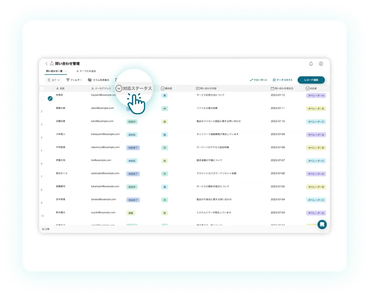 問い合わせ内容やステータスをデータベースで一元管理して対応もれや重複対応を防止します。