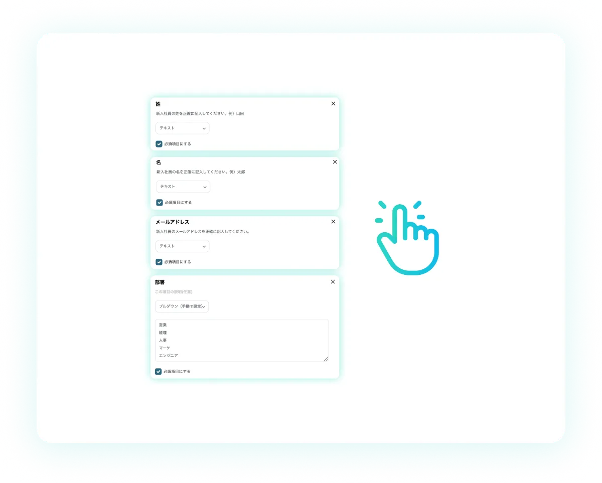 テキスト・日付・数値など任意の項目でフォームを簡単作成。作成したフォームはURLで外部共有もできます。