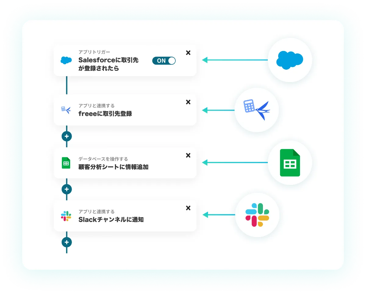 画面上の操作だけで、非エンジニアの方でも簡単に100以上のSaaSを連携することが可能です。