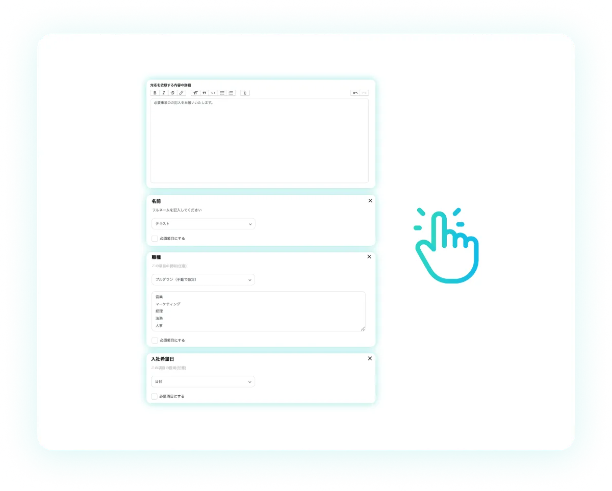 対応依頼のフォームを簡単作成。プルダウンやファイル添付、必須項目の設定など自由自在に作成いただけます。