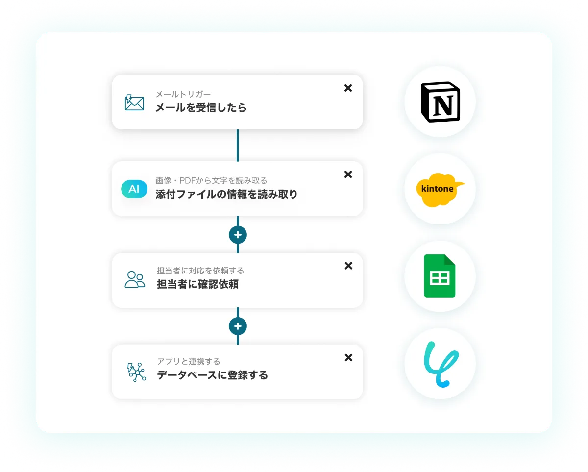 添付ファイルがPDFでもOCR機能で記載内容を読み取り、データベースやツールに登録できます。
