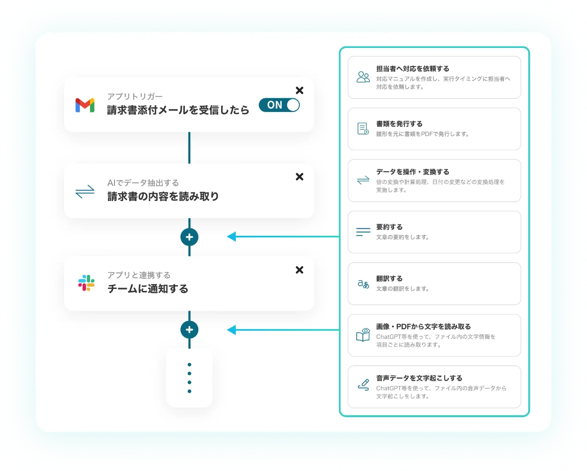 メール受信した請求書の内容を読み取り通知する、などの様々なAIアクションを含んだフローも自動化できます。