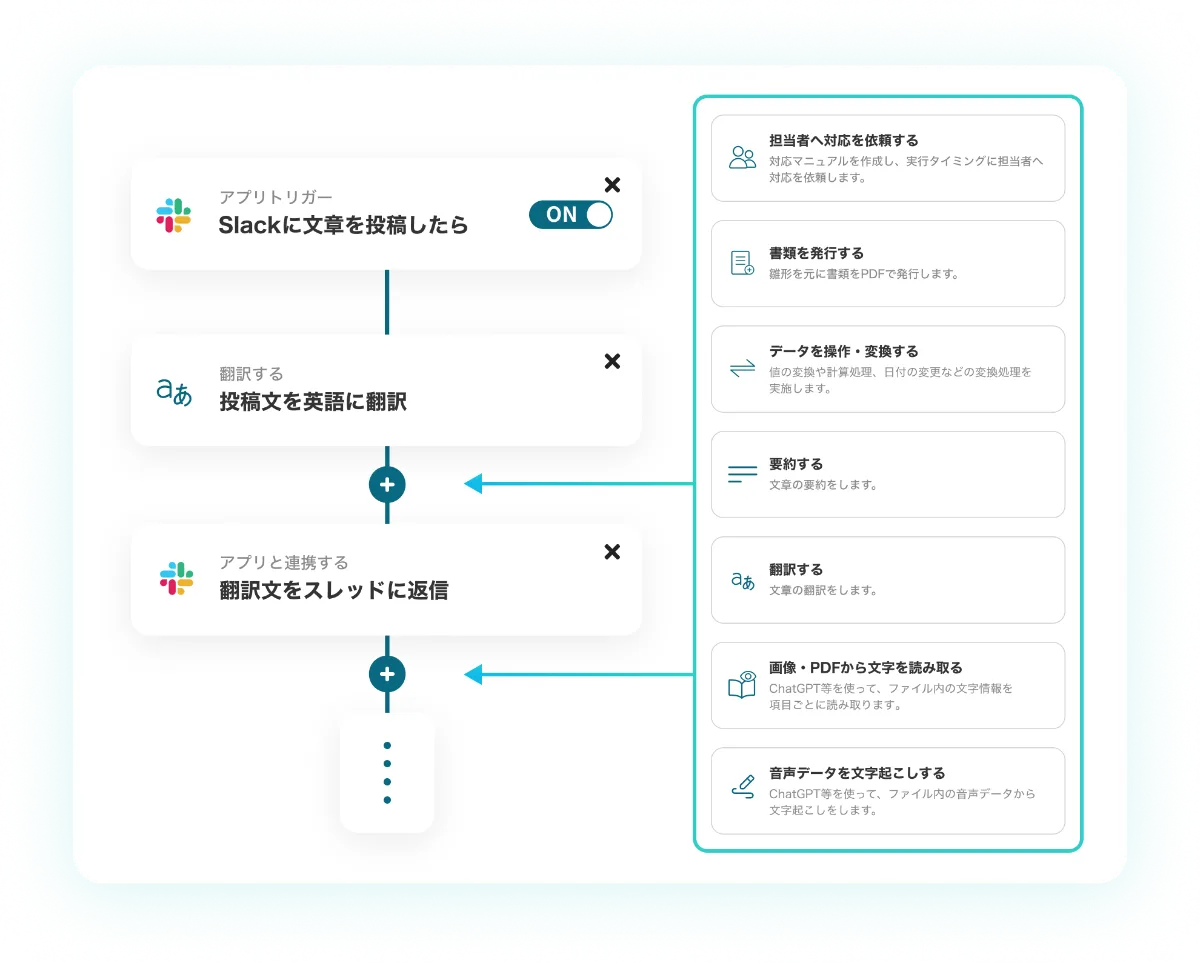 Slackに投稿した文章を自動で翻訳、などの様々なAIアクションを含んだフローを自動化できます。