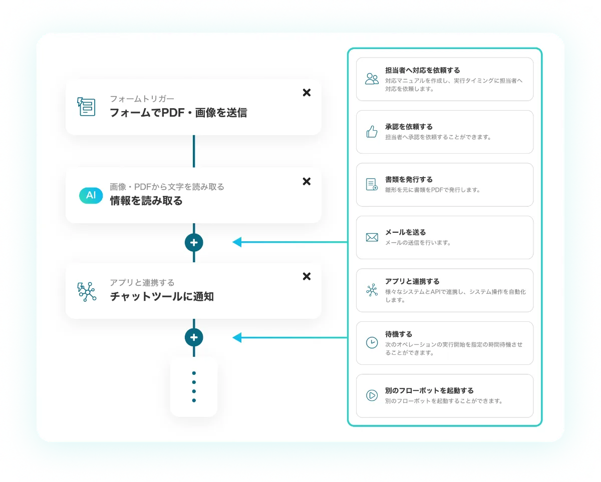 チャットツールへの通知、ファイル格納、担当者への対応依頼などのフローを簡単に作成し、毎回自動で実行することができます。
