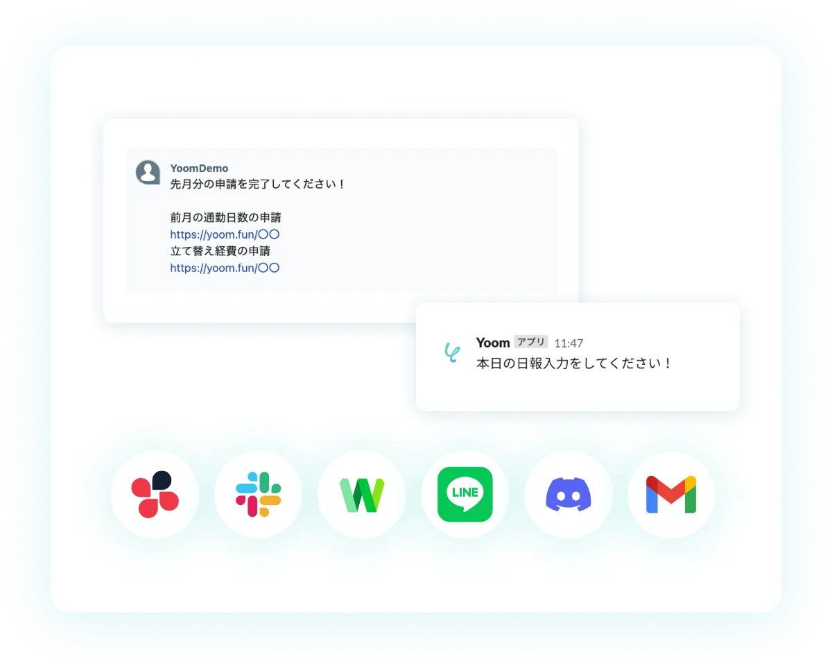国内外700種以上のサービスと多数連携しており、お使いのサービスとシームレスな連携が可能です。 アカウント情報を入れるだけですぐ連携ができ、Yoomがあらゆるサービスのハブとなり業務を自動化します。