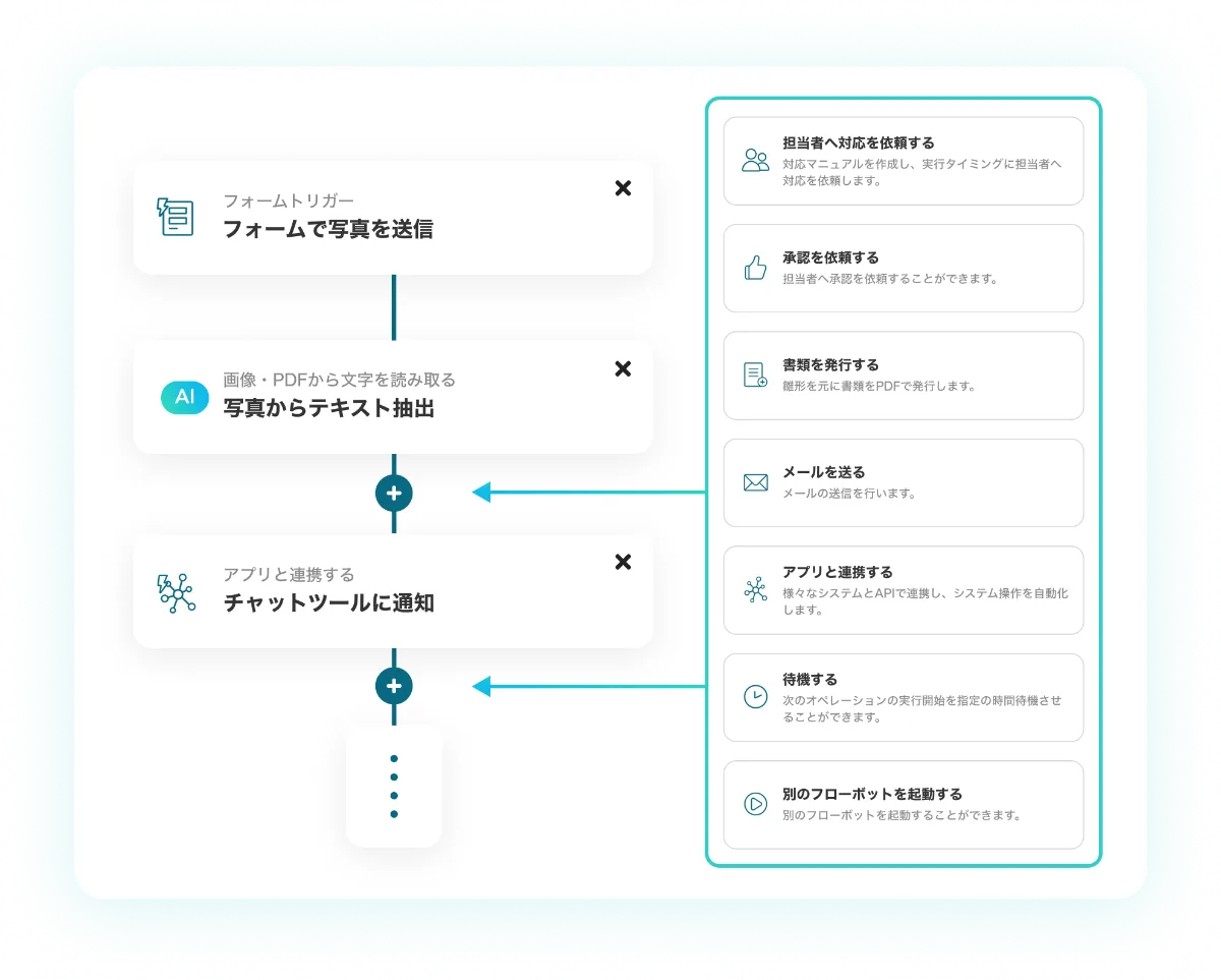 チャットツールへの通知、ファイル格納など、写真から抽出したデータを活用したフローを簡単に作成し、毎回自動で実行できます。