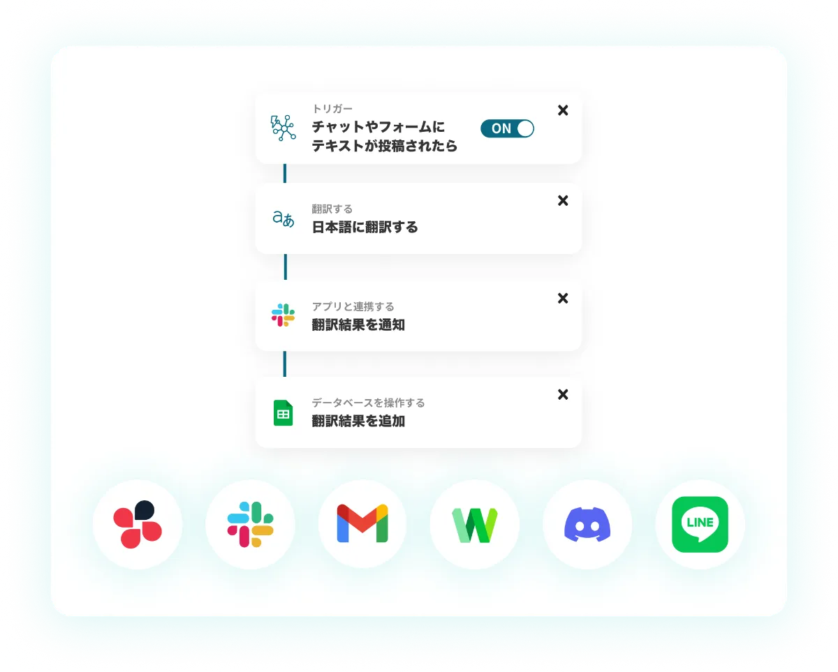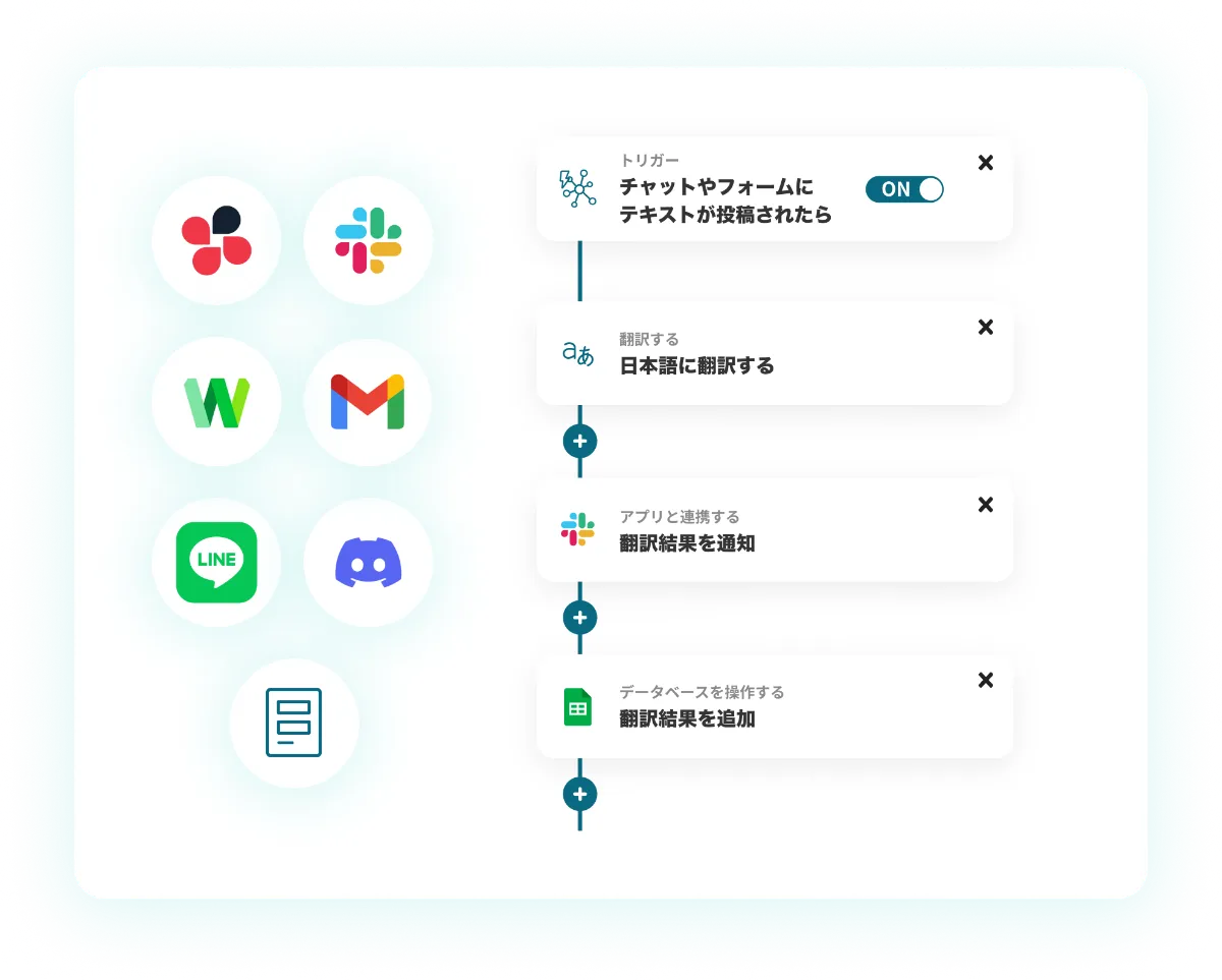 フォームやチャットグループの投稿から任意のテキストをAIで日本語に翻訳して、チャットに通知したり、データベースに登録することができます。