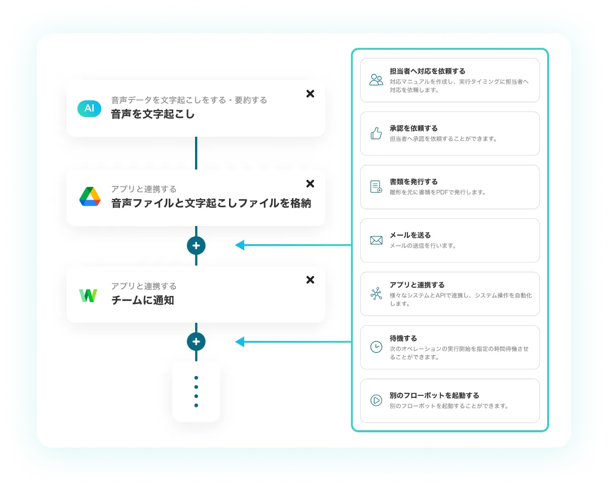 文字起こし結果をチャットツールに自動通知したり、ファイル管理ツールに自動格納するなど、その後のフローも自動化します。